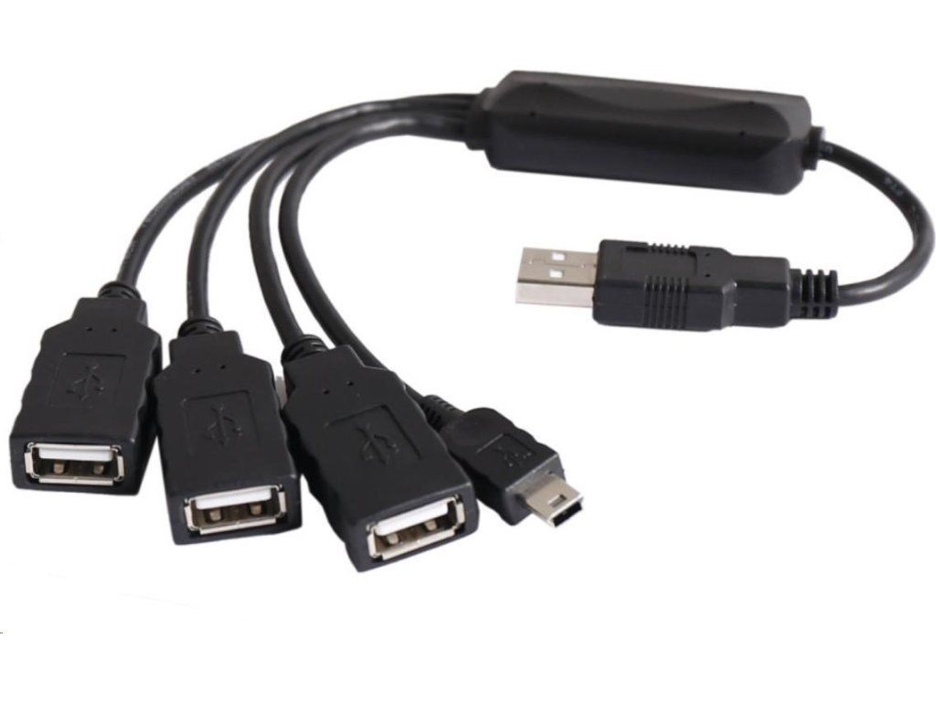 USB 2.0 HUB 4 porty, externý bez napájania - Výstupné konektory 3xUSB A/F + 1xUSB mini 5pin /M - USB 2.0, 1.1 kompatibilný - prenosové rýchlosti 1.5Mb/s/12Mb/s/480Mb/s - napájanie zo zbernice (nie je potrebný napájací adaptér) - hot plug (pripojenie bez reštartovania PC) - detekcia nadprúdu a prevencia preťaženia - 4 porty na pripojenie zariadení - až 127 zariadení v kaskáde Kompaktný USB HUB vhodný napríklad pre notebook alebo stolný počítač na rozšírenie počtu USB 2.0 port. Pekný dizajn. Balené v blistroch so závesným systémom..