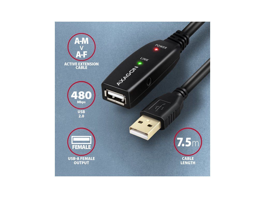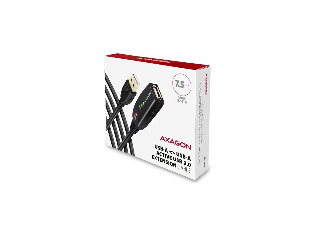 Aktívny predlžovací USB 2.0 kábel AXAGON ADR-207 dĺžky 7,5 metra je ideálny na prepojenie Vášho počítača s USB zariadením ako je myš, klávesnica, webkamera, tlačiareň, skener, plotter a ďalšie. Aktívny USB repeater kábel zväčšuje priepustný signál a umožňuje pripojiť USB zariadenie na výrazne väčšiu vzdialenosť, než Vám umožní pasívny kábel. Dosah kábla je možné ďalej predĺžiť použitím niekoľkých káblov za sebou.