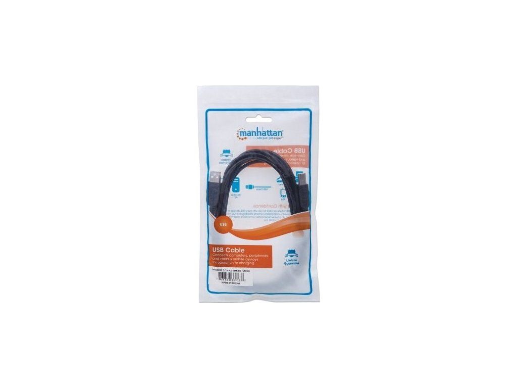 MANHATTAN Hi-Speed USB 2.0 Káble zariadení umožňujú jednoduché pripojenie periférnych zariadení a príslušenstva USB k stolným počítačom a notebookom. Ideálny na použitie s mnohými externými krytmi USB, rozbočovačmi a inými zariadeniami s funkciou hot-swap, plug and play, MANHATTAN Hi-Speed USB 2.0 Káble zariadení podporujú prenos dát rýchlosťou až 480 Mb/s v systémoch Windows a Mac pre rýchle a spoľahlivé prenosy. Pozlátené kontakty, tienenie a plne tvarované pätky s odľahčením ťahu pomáhajú zabezpečiť spoľahlivé pripojenie, maximálnu vodivosť a minimálnu stratu dát pri zníženom rušení EMI.