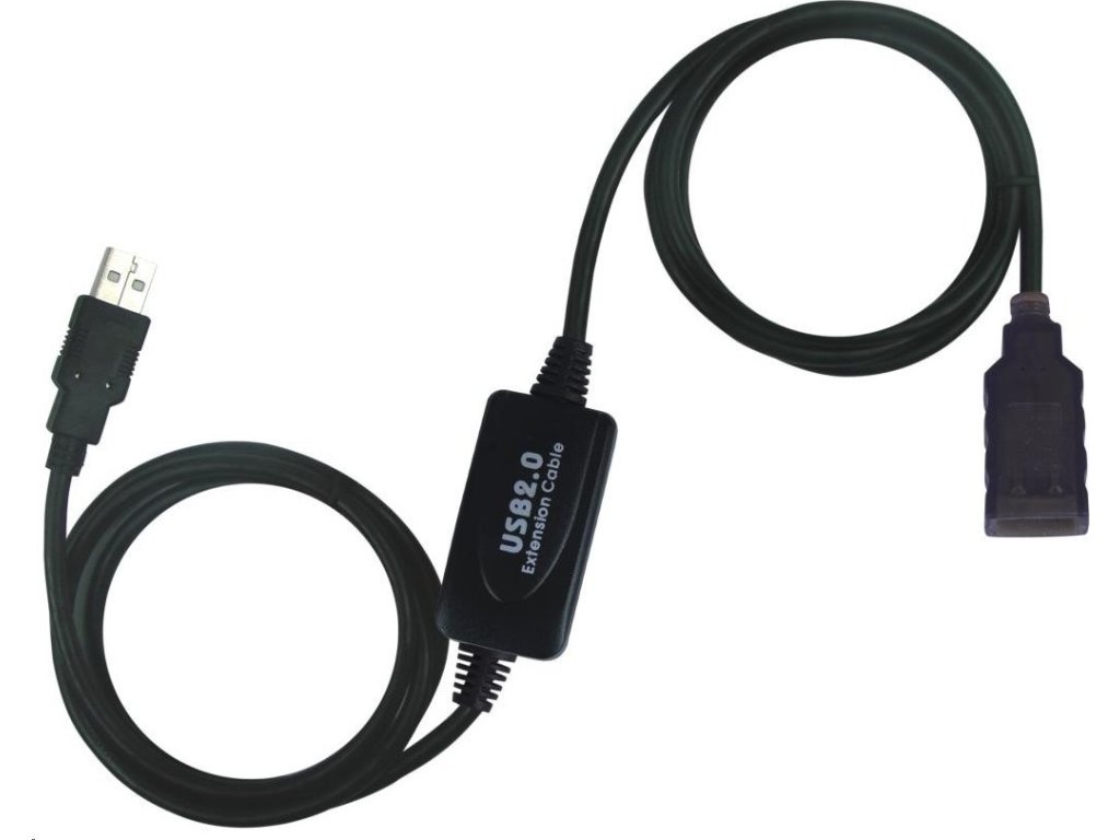 - aktívny predlžovací kábel opakovača má konektory A-male a A-female, konektor A-male sa zapája do počítača, konektor A-female sa zapája do kábla zo zariadenia USB.