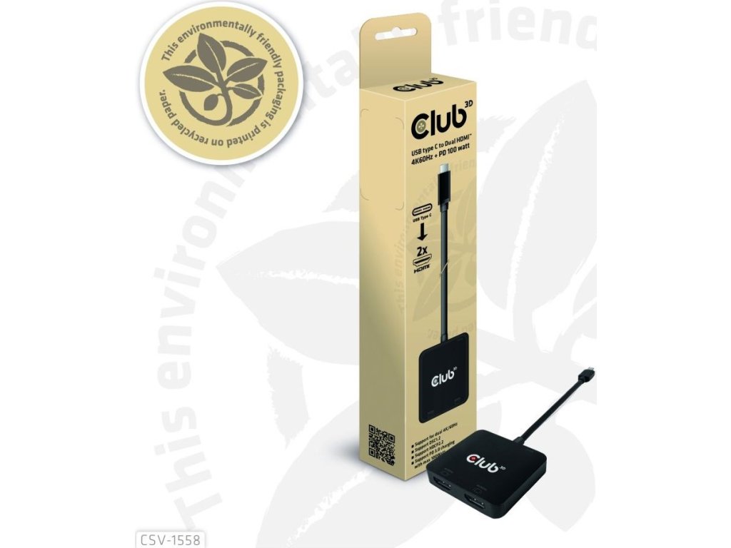 Club 3D CSV-1558 USB Type-C na Dual HDMI™ 4K60Hz + PD 100 watt Nabíjanie v režime DP1.4 Alt, umožňujúce rozšíriť port USB Type-C hostiteľa na 2x HDMI™ displeje s ultra vysokým rozlíšením max 4K60Hz pre každý displej súčasne. Vďaka podpore funkcie MST je možné zobraziť duálne displeje s rôznym obsahom videa súčasne. Okrem toho podporuje nabíjanie PD s maximálnym výkonom 100 W. Môže fungovať na všetkých zariadeniach USB Type-C alebo Thunderbolt™ s podporou režimu DP™ Alt (vrátane telefónov s pripojením USB Type-C a podporou režimu DP™ Alt).