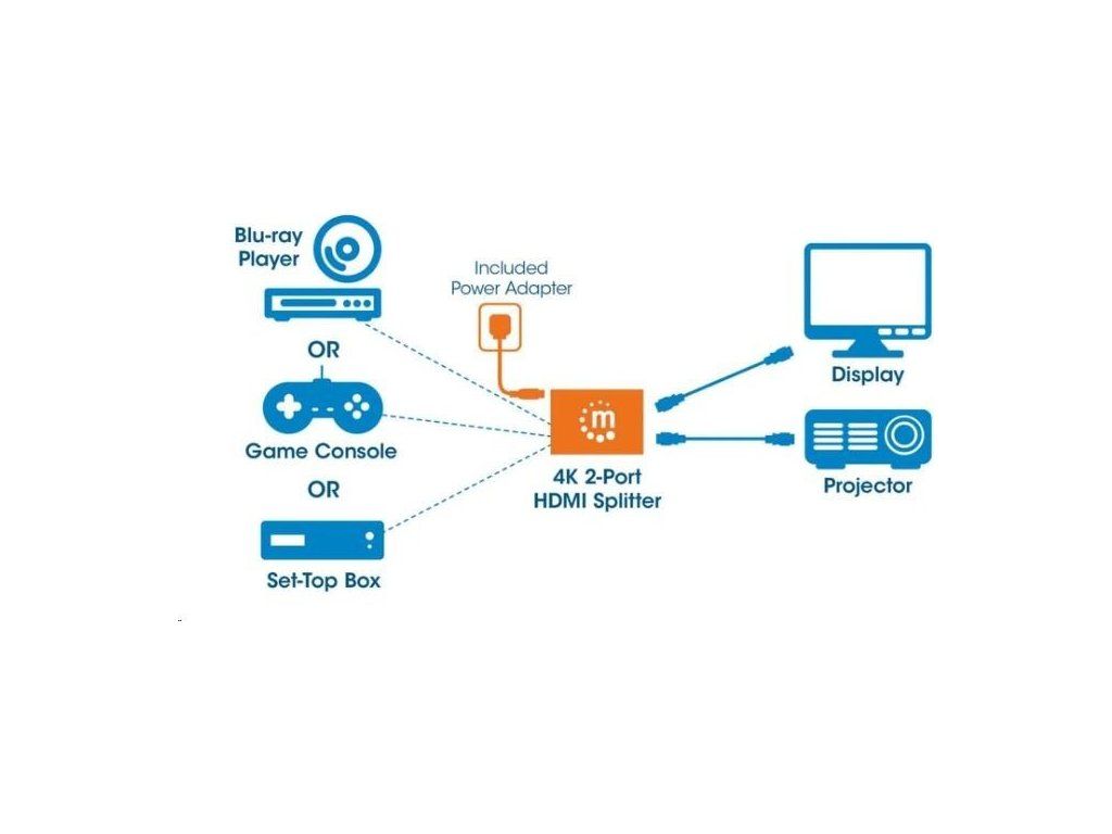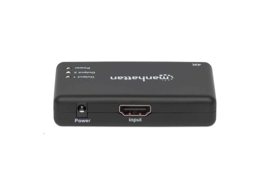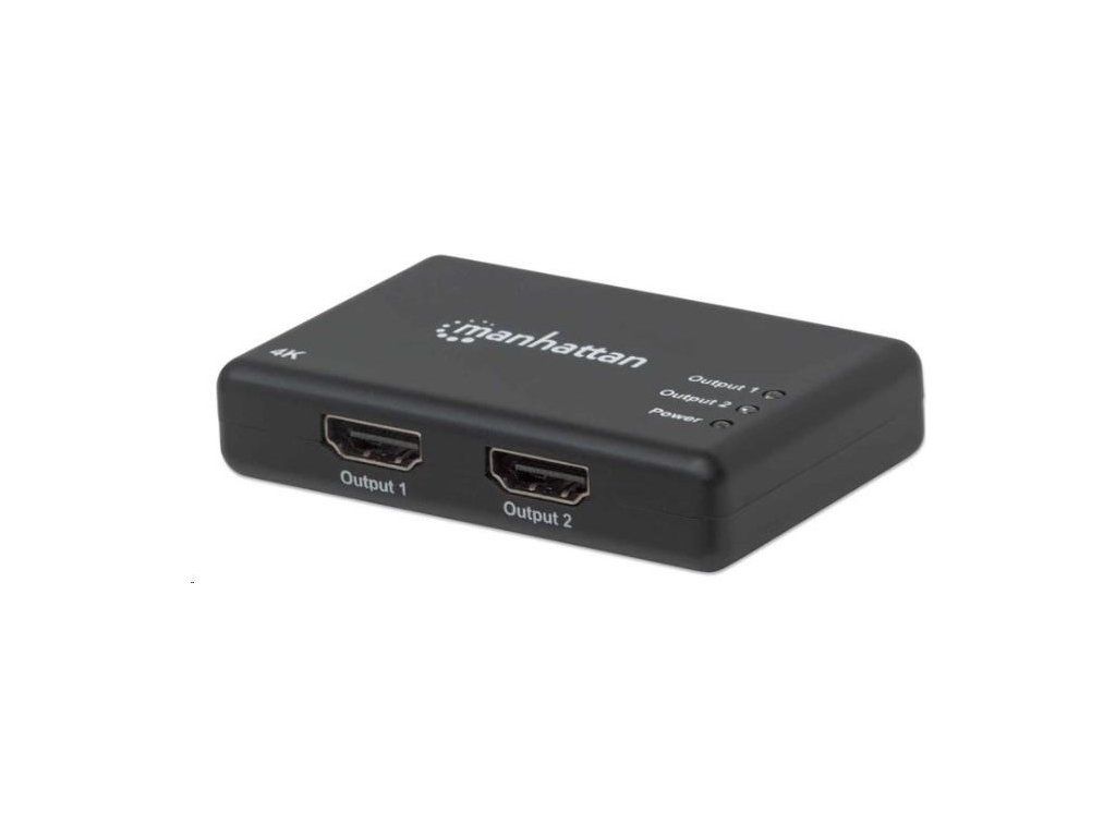 Manhattan 4K 2-portový rozdeľovač HDMI so zabudovaným zosilňovačom prenáša signál 4K HDMI z jedného zdroja UHD až na dva displeje UHD.
