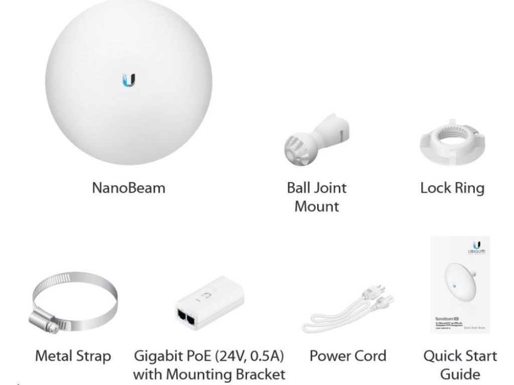 obsah balenia: - Zariadenie - Gigabitový napájací adaptér PoE 24V/0.5A - Napájací kábel - Napínacia páska - Plastový spoj + plastový zámok