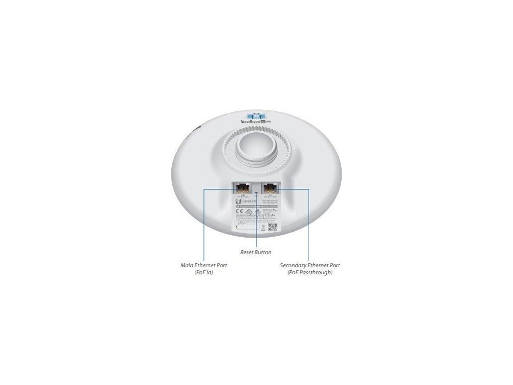 vnútri NanoBeamu sa nachádza výkonný procesor MIPS Atheros 74KC s frekvenciou 720 MHz, na ktorý nadväzuje 128 MB operačnej pamäte typu DDR2 a 8 MB pamäte Flash. Sieťový port podporuje 10/100/1000 Ethernet a možno ho použiť na napájanie jednotky pomocou dodaného pasívneho gigabitového adaptéra PoE 24V/0,5A (aktívne PoE podľa 802.3af nie je podporovaný).