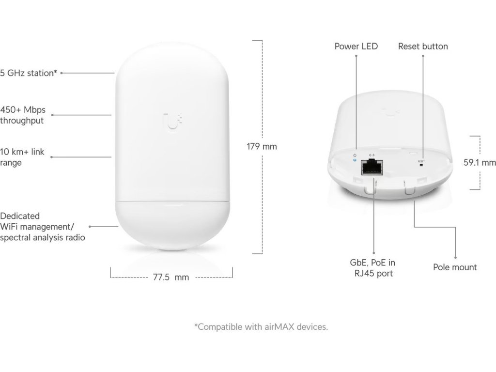 nanoStation 5AC Loco je veľmi malá 13dBi klientska stanica radu airMAX ac, ktorá dosahuje veľmi vysoké prenosové rýchlosti a stabilné pripojenie aj v rušnom prostredí. Jednotka je kompatibilná len s inými produktmi airMAX ac a je určená na vonkajšie použitie. S možnými nastaveniami šírky kanála 10/20/30/30/40/50/60 a 80 MHz možno s moduláciou 256QAM dosiahnuť skutočnú priepustnosť až 450 Mb/s+...