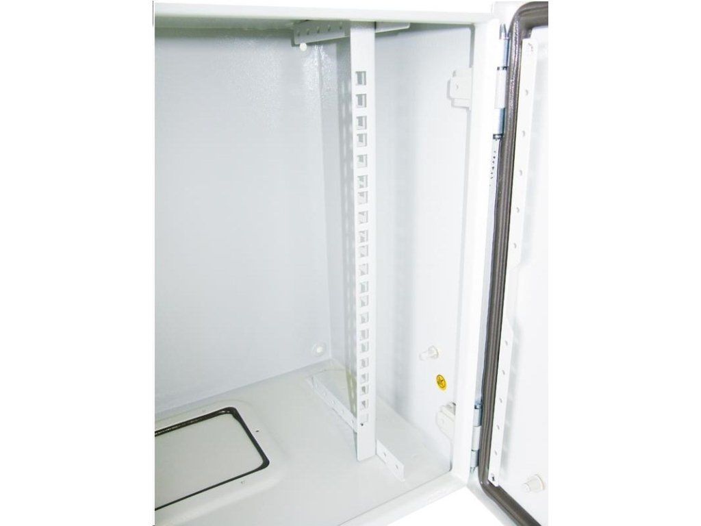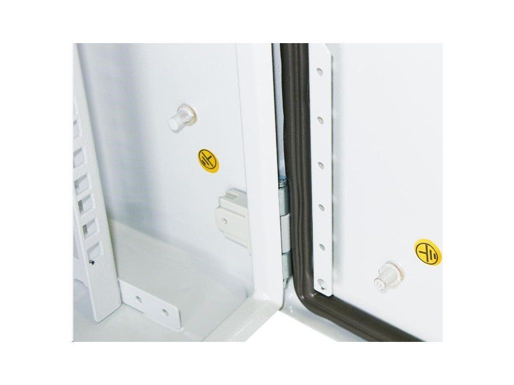 Vonkajší nástenný rozvádzač vyrobený z válcované ocele s hrúbkou 1,5 mm. Trojvrstvová povrchová úprava. Vykonanie: dvere - plné, otvárateľné o 110°, zameniteľný smer otvárania, tesnenie z penového polyuretánu zadný kryt - plný bočný kryt - plný horný kryt - plný