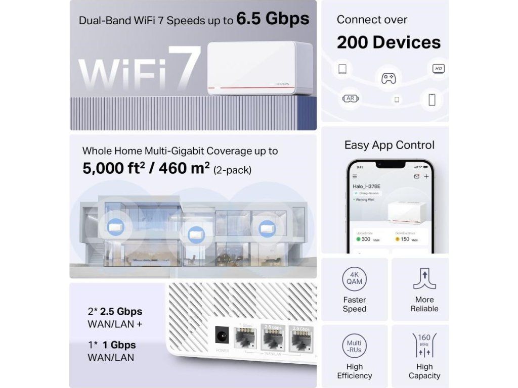 - Najnovší Wi-Fi 7: Vďaka kanálom 160 MHz, 4K-QAM, MLO a ďalším funkciám, ktoré ponúka Wi-Fi 7, bude vaša sieť ohromujúci výkon.