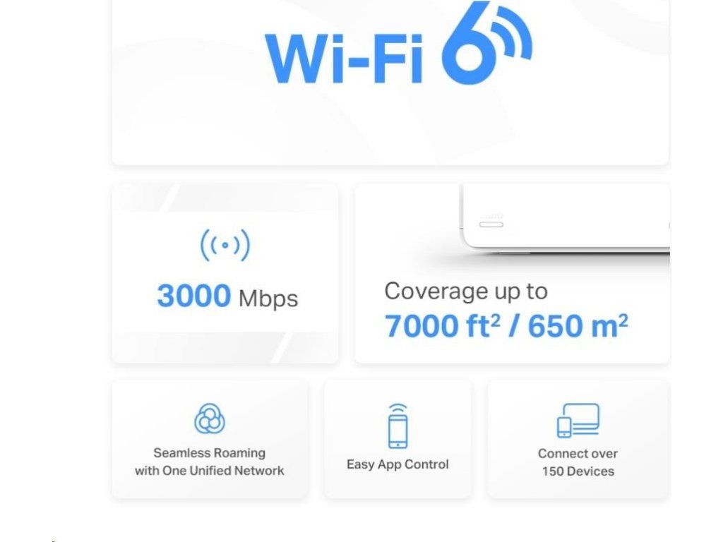 - Dvoupásmové Wi-Fi 6 pripojenie s rýchlosťou až 3 000 Mbit/s – 2 402 Mbit/s v pásme 5 GHz + 574 Mbit/s v pásme 2,4 GHz.
