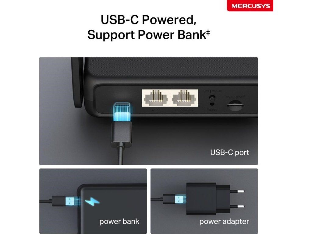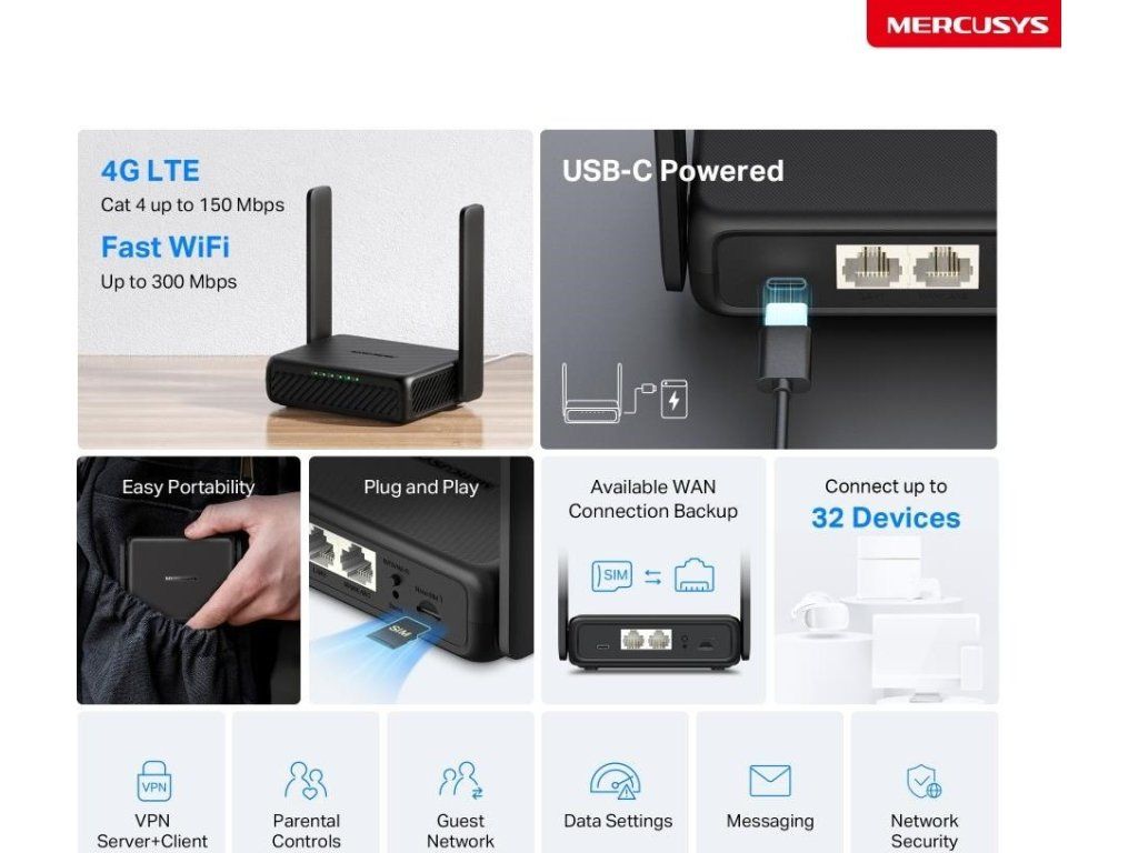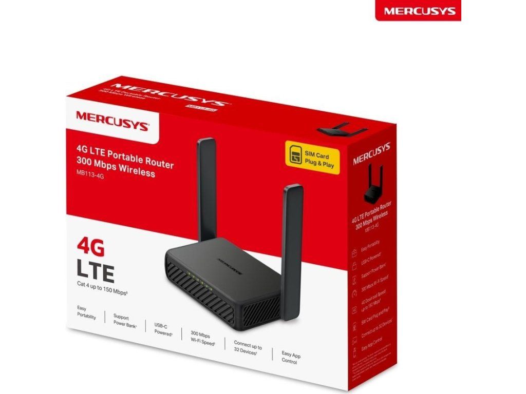 Mercusys MB113-4G WiFi4 router (N300, 4G LTE, 2,4GHz, 1x100Mb/s LAN/WAN,1x100Mb/s LAN,1xnanoSIM)