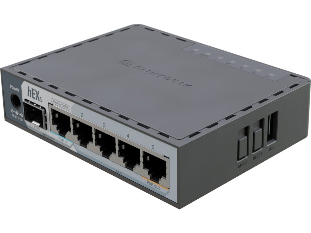 MikroTik hEX S je kompaktní, výkonný a cenově dostupný drátový router, který je ideální volbou pro chytré domácnosti nebo menší kanceláře. Zařízení nabízí 5 Gigabitových ETH portů, přičemž Ether1 podporuje PoE-in a Ether5 PoE-out, což umožňuje napájení dalšího zařízení přímo z routeru. Výstupní napětí na PoE-out portu odpovídá vstupnímu napájení routeru. Hlavní předností je ale 2.5G SFP port, díky kterému lze plně využít potenciál rychlého připojení – například k NAS serveru nebo optické síti poskytovatele. Router lze napájet přes DC konektor 12-57V, přes PoE-in v rozmezí 18-57V nebo standardu 802.3af/at.