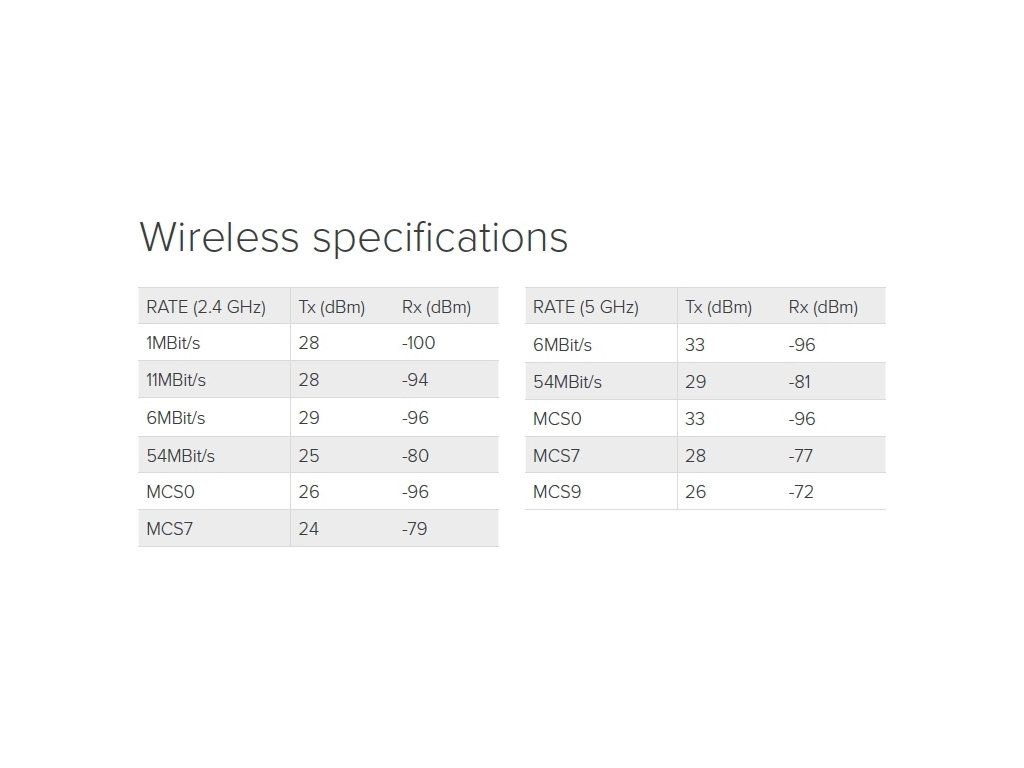 V porovnaní s rackovou verziou má táto 4 pevné všesmerové antény so ziskom 3dBi, o ktoré sa starajú 2 zabudované rádiové časti s modulačnými rýchlosťami 1733 Mb/s (5 GHz) a 300 Mb/s (2.4GHz).