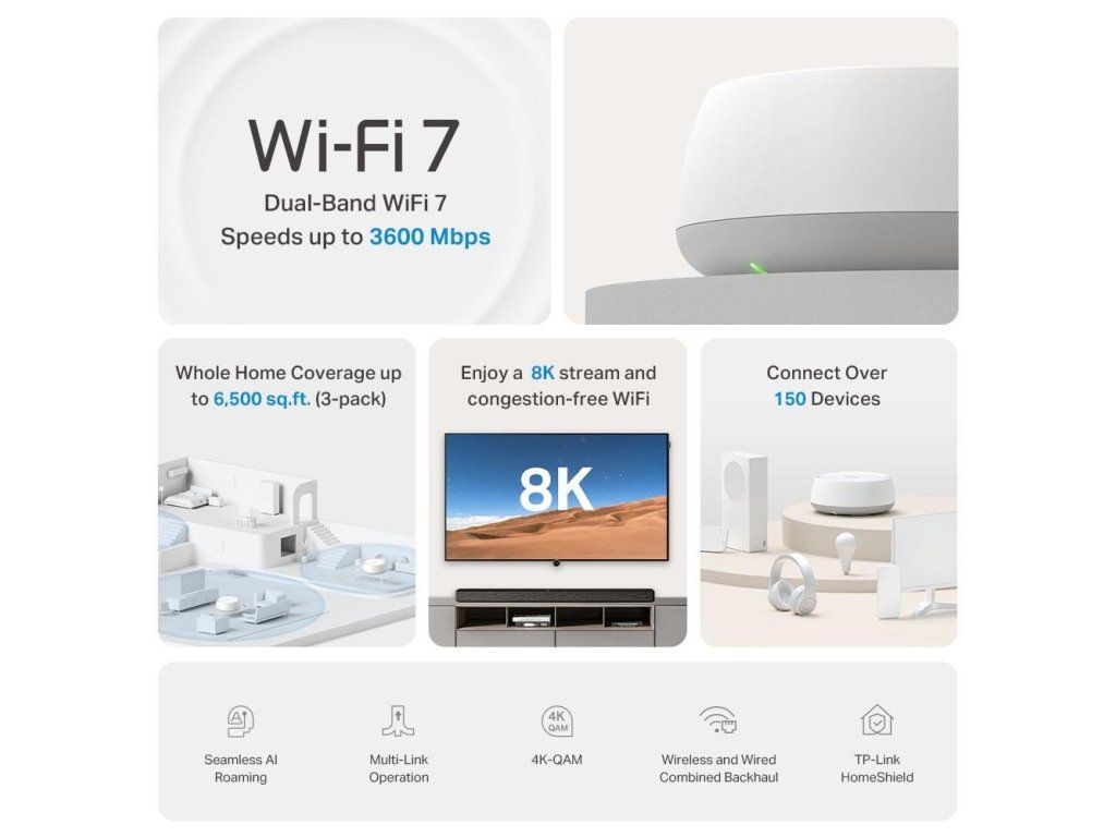| Pokročilé funkcie | • Multi-Link Operation (MLO) • 160 MHz kanál • 4K-QAM • Multi-RUs • Funguje s Alexou a Google Assistant |