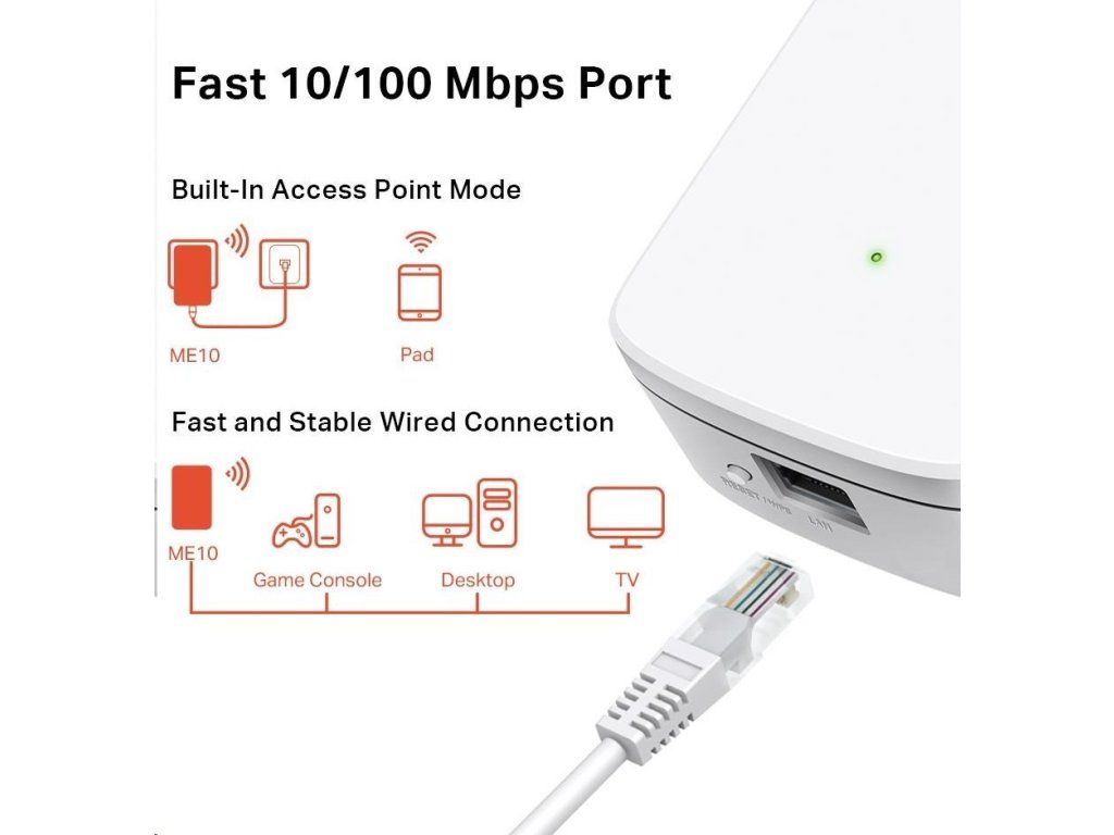 Nástenný extender signálu ME10 slúži na rozšírenie pokrytia Wi-Fi siete a posilnenie signálu existujúcej hostiteľskej siete. S rýchlosťami pripojenia až 300 Mbit/s môžete Wi-Fi sieť každý deň využívať na hranie online hier, sťahovanie veľkých súborov a sledovanie filmov na ľubovoľnom mieste v dome.