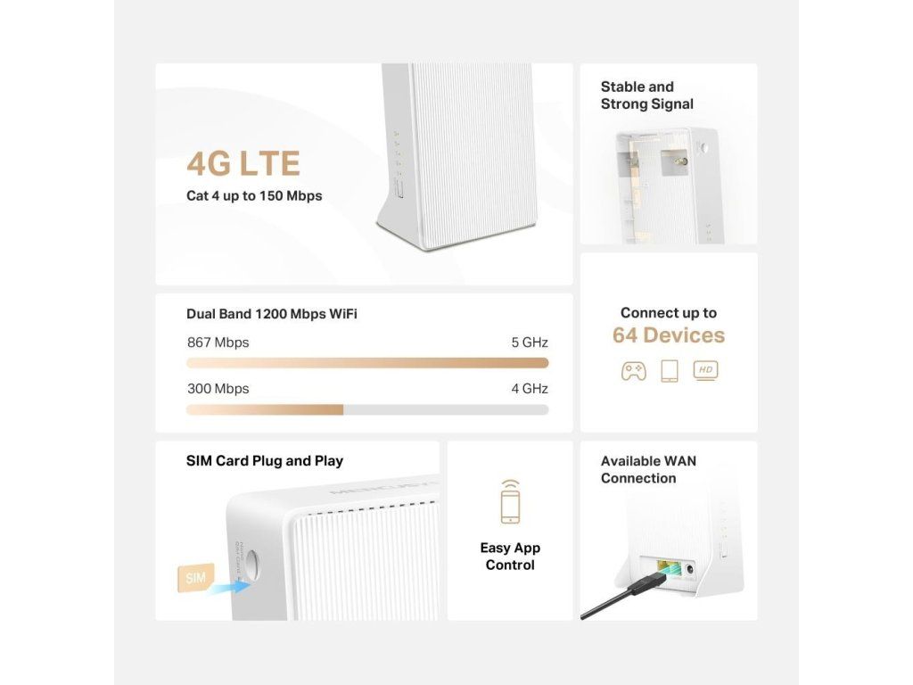 | Obsah balenia | AC1200 Wireless Dual Band 4G LTE Router (MB130-4G) Napájací adaptér RJ45 Ethernetový kábel Rýchly sprievodca inštaláciou |
