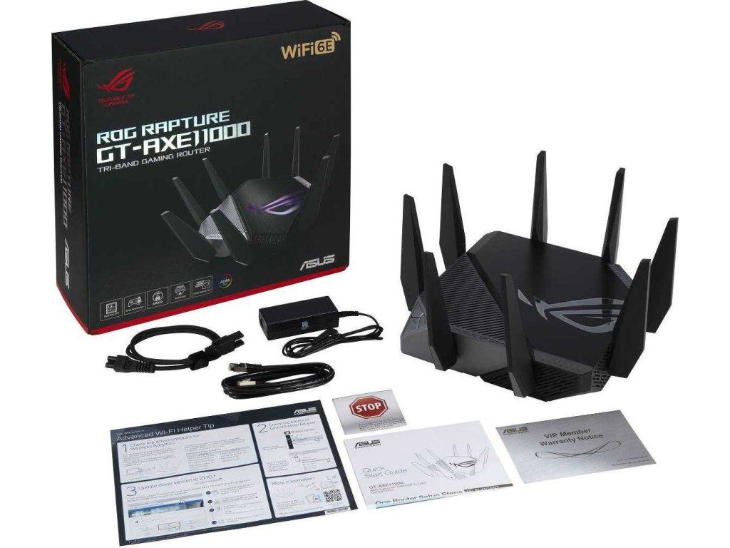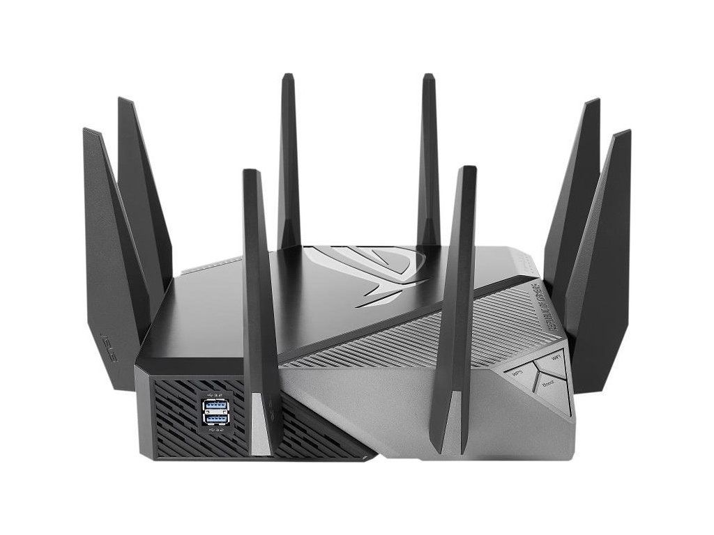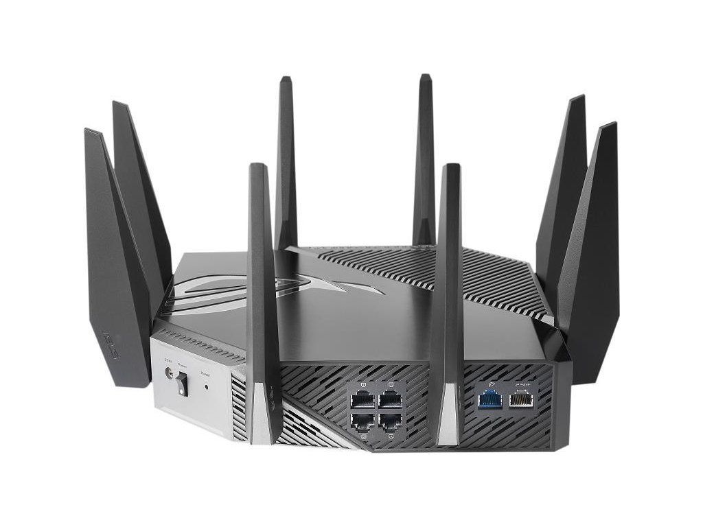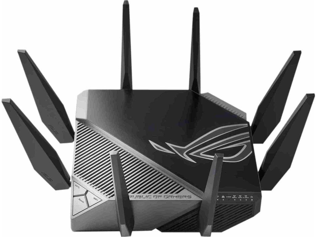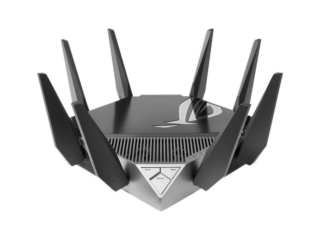 ROG Rapture GT-AXE11000 Trojpásmový herný router GT-AXE11000 WiFi 6E (802.11ax), nové pásmo 6 GHz, 2.port 5G WAN/LAN, kompatibilita s PS5, agregácia WAN, VPN Fusion, trojúrovňová akcelerácia hier, bezplatné zabezpečenie siete a podpora AiMesh Štandard WiFi novej generácie - prvý trojpásmový router WiFi 6E na svete zvyšuje rýchlosť až na 11 000 Mb/s. Nové pásmo 6 GHz - širšie kanály a vyššia kapacita prinášajú vyšší výkon, nižšiu latenciu a menej rušenia. 2.5G WAN/LAN Port - Všetka sieťová prevádzka prechádzajúca cez 2.port 5G má najvyššiu prioritu a 2.port 5G tak môže naplno využiť potenciál WiFi 6. Výkon vďaka špičkovej technológii - štvorjadrový procesor, pokročilý systém chladenia a optimalizovaný dizajn antény posúvajú výpočtové možnosti na úplne novú úroveň. Trojúrovňová akcelerácia hry - zrýchlenie herných dát na každej zastávke od zariadenia až po herný server. RJ45 pre Gigabits BaseT pre WAN x 1, RJ45 pre Gigabits BaseT pre LAN x 4, RJ45 pre 2.5G BaseT pre WAN/LAN x 1 ROG Rapture Wifi 6 802.11ax Trojpásmový gigabitový herný router Wifi 6 802.11ax 1148Mbps (2.4G) Wifi 6 802.11ax 4804Mbps (5GHz) Wifi 6E 802.11ax 4804Mbps (6GHz) OFDMA + MU-MIMO, 1024 QAM, trojúrovňová akcelerácia hier, osvetlenie Aura RGB, ROG Boost Key, 2.5G Multi-Gigabit Gaming Port, WiFI Radar a Zero Wait DFS, AiProtection Pro, VPN Fusion Adaptive QoS, Bandwidth control, AiMesh, ASUS Roter APP (ROG theme).