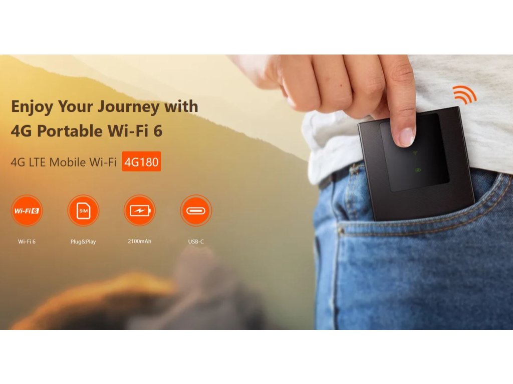 Bezdrátový 4G LTE / 3G bateriový router s Wi-Fi 6 (802.11ax/b/g/n). Baterie 2100mAh, výdrž až 8,5 hodin. Slot pro standardní kartu nanoSIM. 4x LED indikace, podpora WPA3 / WPA2 / WPA. Port USB-C pro nabíjení.