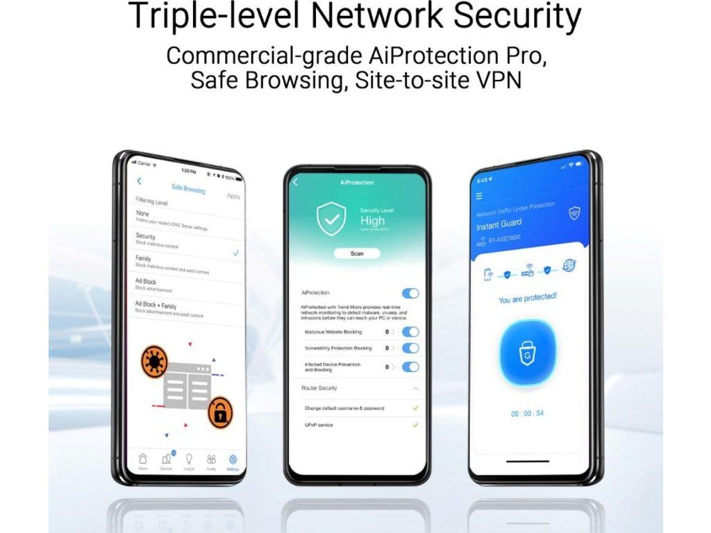 | Zabezpečenie | AiProtection VPN WPA/WPA2/WPA3-Personal, WPA/WPA2-Enterprise WPS Let's Encrypt DNS-over-TLS Bezpečnostné skenovanie Firewall |