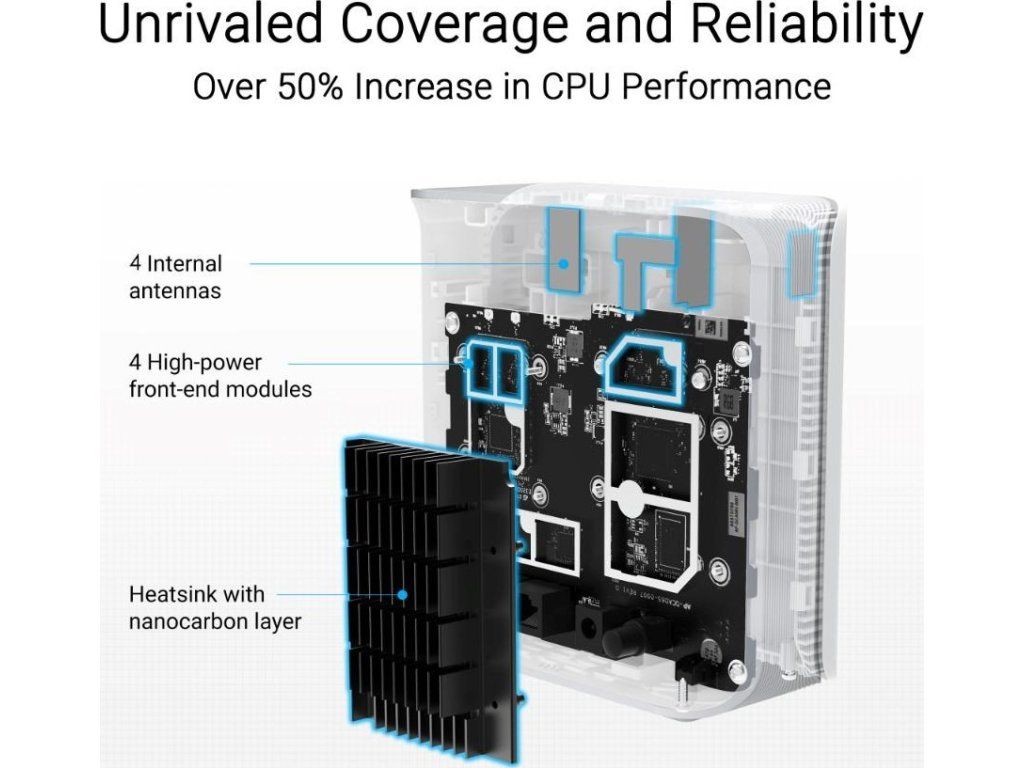 - Štyri interné antény a štyri vysoko výkonné predné moduly eliminujú mŕtve zóny WiFi
