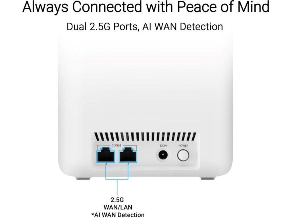 - Technológia ASUS AiMesh zvyšuje pokrytie až na 6500 štvorcových stôp (3 balenia) a jednoduchá rozširiteľnosť pomocou kompatibilných routerov ASUS pre bezproblémové a bezpečné WiFi v celej domácnosti