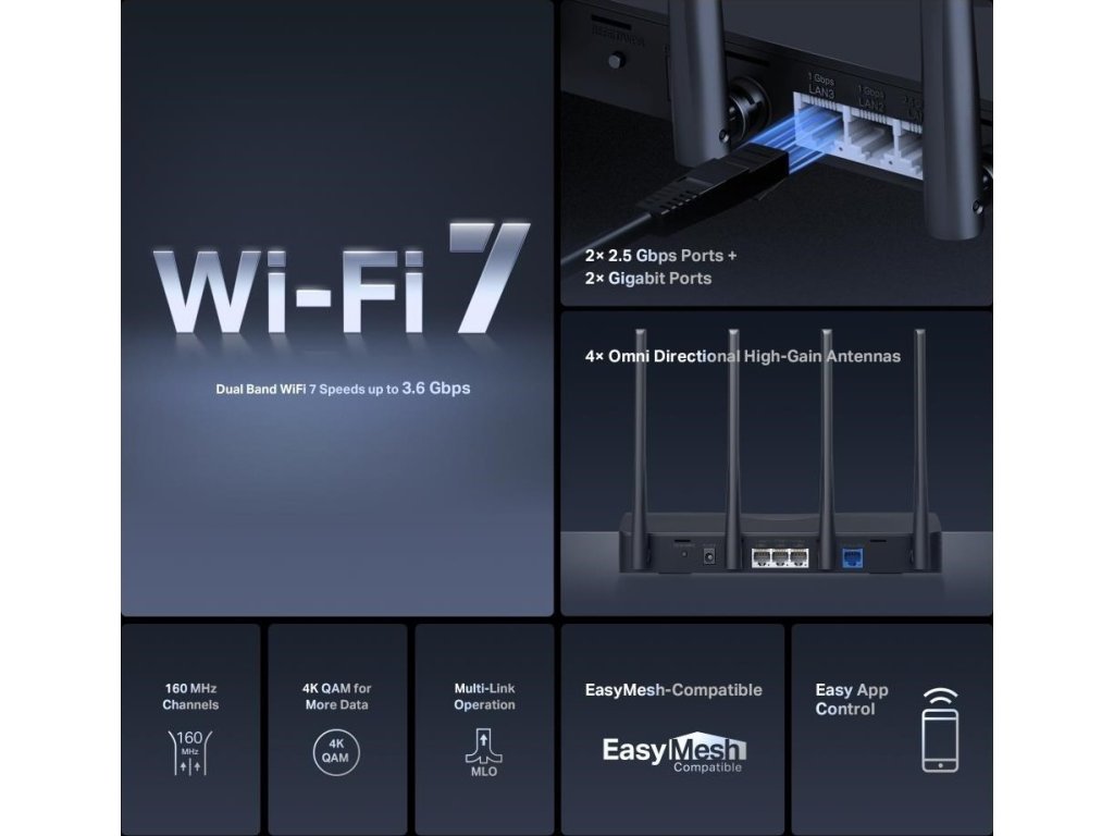 - Najnovší Wi-Fi 7– Vďaka kanálom 160 MHz, 4K-QAM, MLO, pásmu 6 GHz a ďalším funkciám, ktoré Wi-Fi 7 ponúka, bude mať vaša sieť ohromujúci výkon.