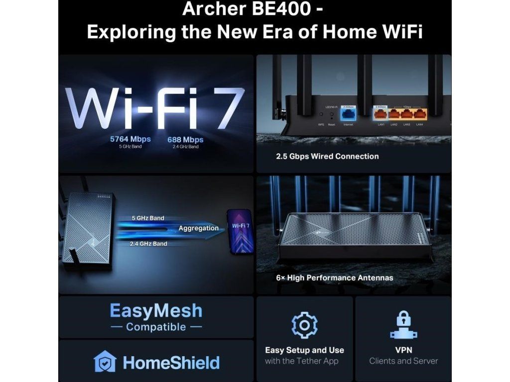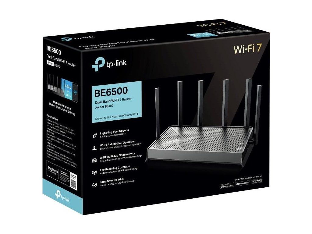 TP-Link Archer BE400 EasyMesh WiFi7 router(BE6500,2,4GHz/5GHz,1x2,5GbEWAN,1x2,5GbELAN,3xGbELAN,1xUSB3.0)