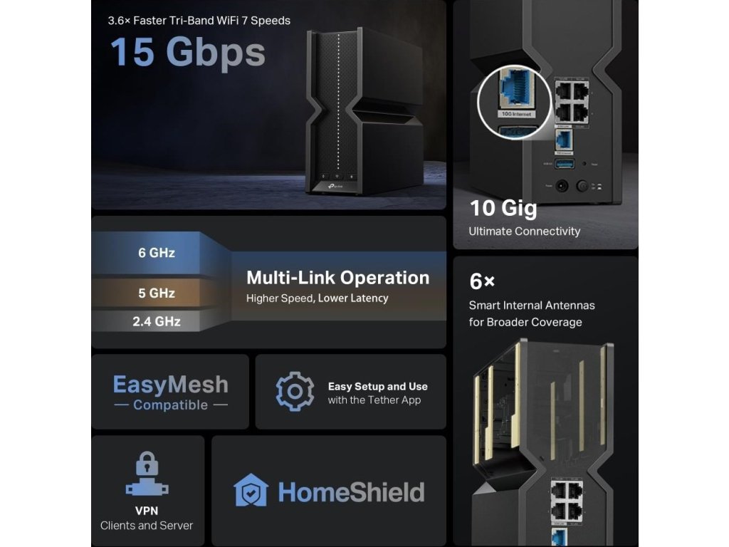 - Trípásmová Wi-Fi s bleskovou rýchlosťou 15 Gb/s: Wi-Fi 7 naplno využíva potenciál pásma 6 GHz s kanálmi až 320 MHz a rýchlosťou Wi-Fi 11,5 Gb/s. Užívajte si plný prístup ku streamovaniu v rozlíšení 8K a vysokorýchlostnému sťahovaniu.