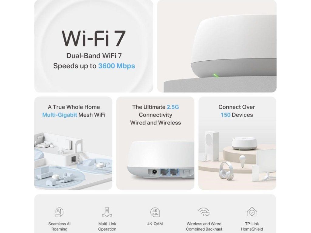 | Pokročilé funkcie | • Multi-Link Operation (MLO) • 160 MHz kanál • 4K-QAM • Multi-RUs • Funguje s Alexa a Google Assistant |