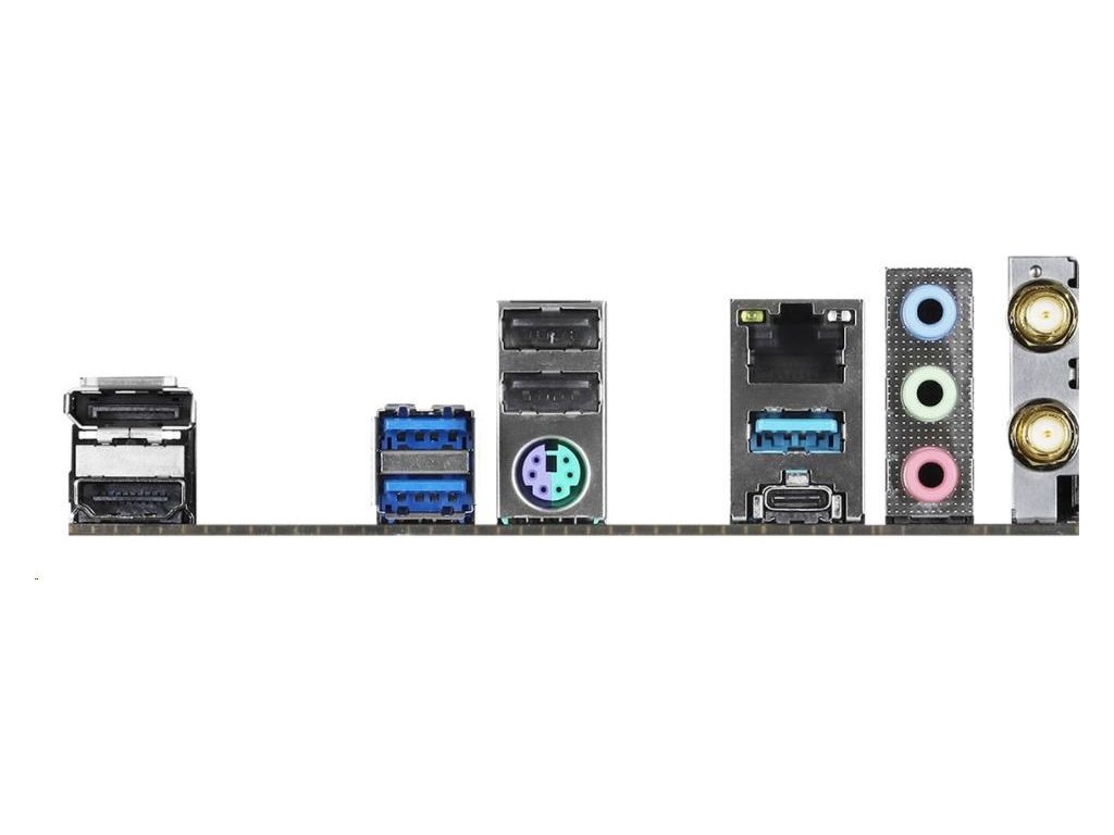 | Vstupy/výstupy na zadnom paneli | - 2 x porty antény - 1 x port myši/klávesnice PS/2 - 1 x port HDMI - 1 x port DisplayPort 1.4 - 2 x USB 2.0 Porty (podporuje ochranu proti ESD) - 3 x USB 3.2 porty typu A Gen1 (podporuje ochranu proti prepätiu) - 1 x USB 3.2 porty typu C Gen1 (podporuje ochranu proti ESD) - 1 x port RJ-45 LAN s LED diódou (ACT/LINK LED a SPEED LED) - HD audio konektory: Line in / predný reproduktor / mikrofón |