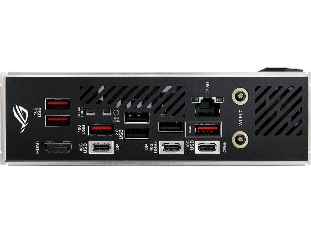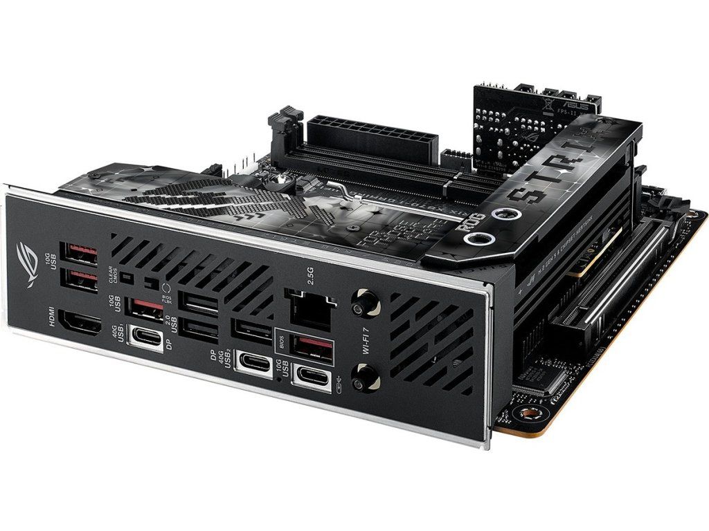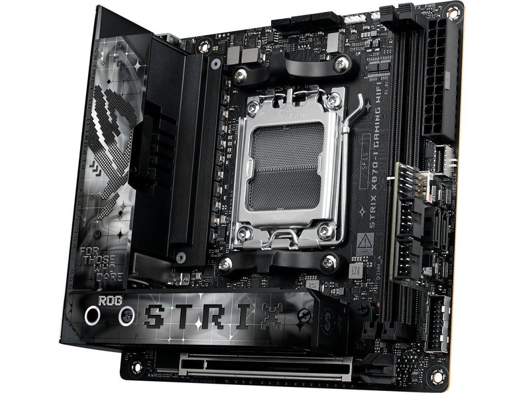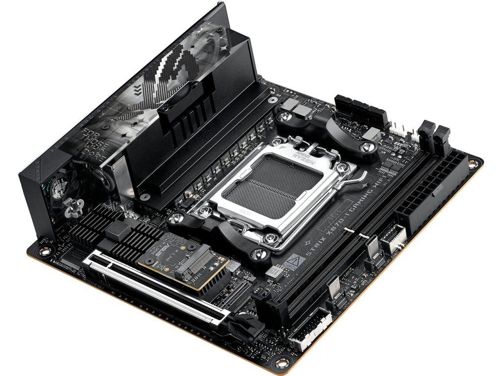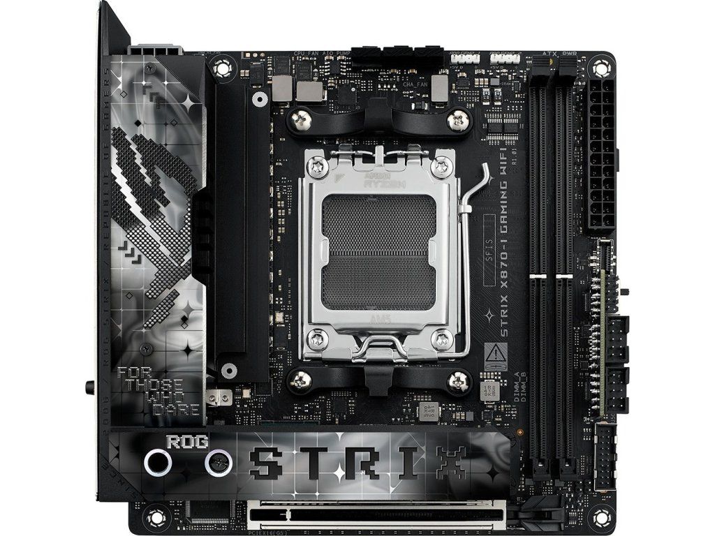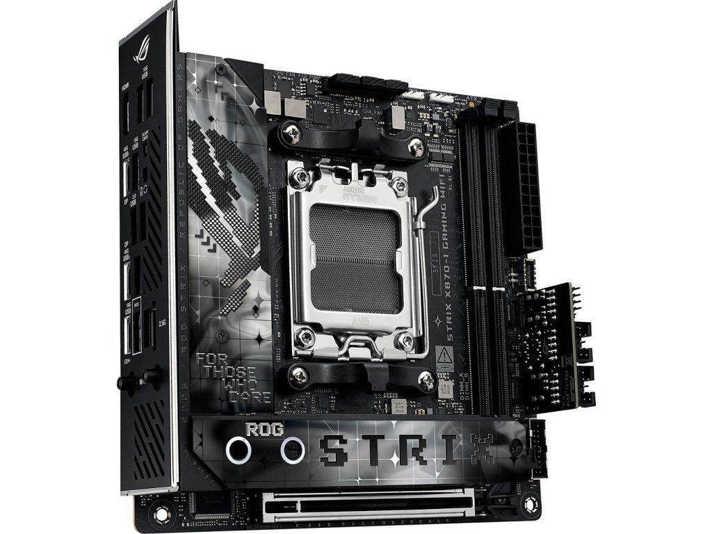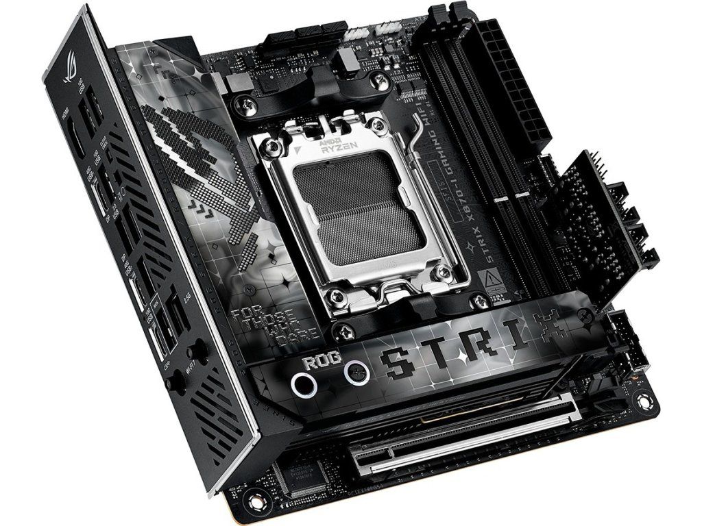 AMD X870 Mini-ITX základná doska s 10+2+1 napäťovými stupňami, Dynamic OC Switcher, Core Flex, DDR5 zásuvkami s AEMP, WiFi 7 s ASUS WiFi Q-Antenna, dve M.2 zásuvky, PCIe 5.0 x16 SafeSlot s PCIe Slot Q-Release Slim a plnou podporou grafických kariet budúcnosti, dva USB4 porty, ROG Strix Hive II, AI Overclocking, AI Cooling II, AI Networking II a Aura Sync RGB osvetlenie.