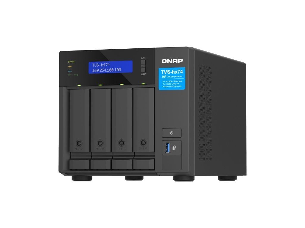 QNAP TVS-h474-PT-8G (2core 3,7GHz, ZFS, 8GB RAM, 4x SATA, 2x M.2 NVMe, 2x PCIe, 2x 2,5GbE, 1x HDMI)