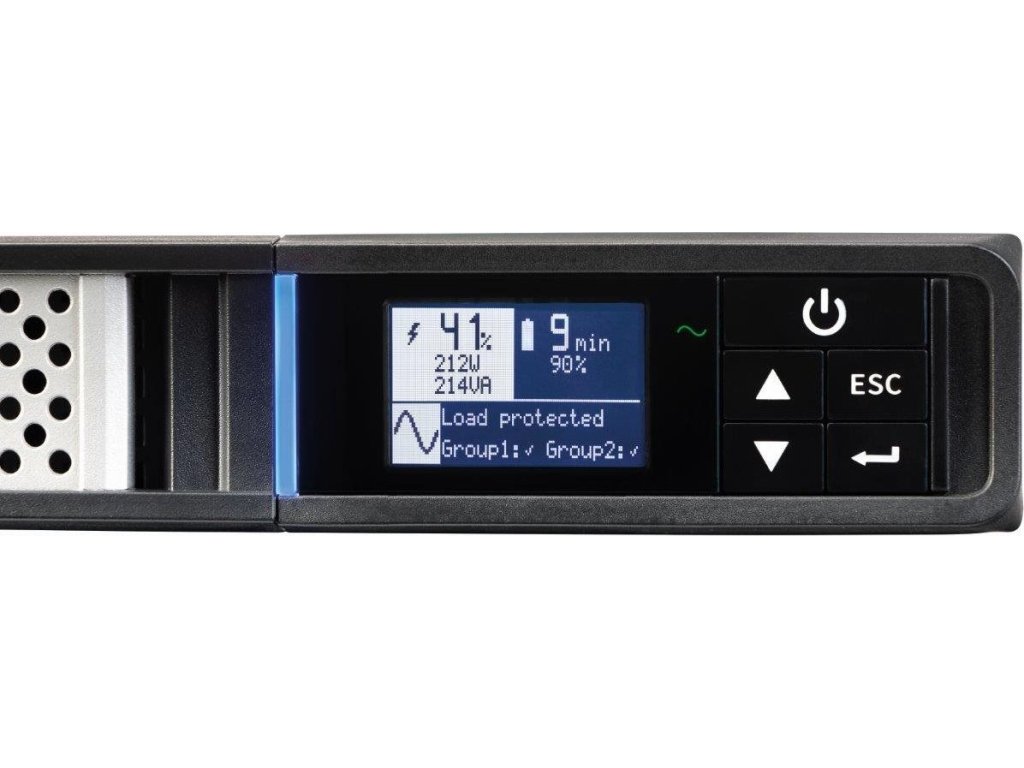 - Nový grafický LCD displej poskytuje na jednej obrazovke základné informácie o stave UPS a o meraných veličinách (v siedmich jazykoch podľa voľby). K dispozícii sú aj rozšírené možnosti konfigurácie pomocou zrozumiteľných navigačných tlačidiel.
