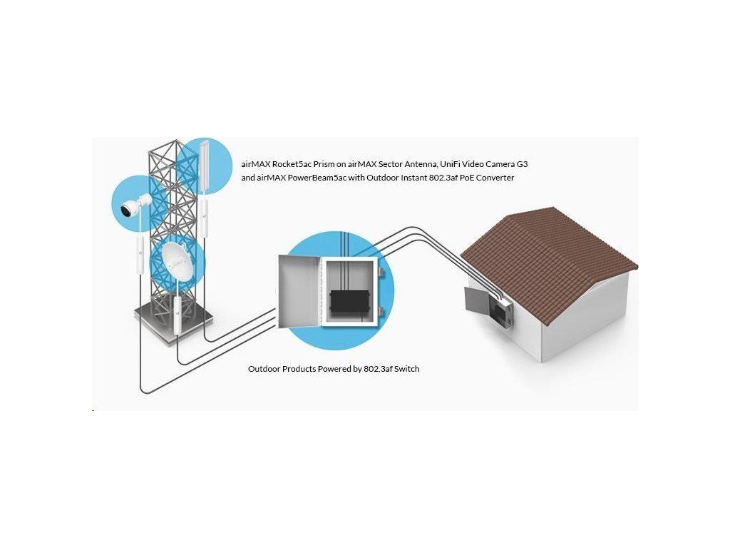 tento gigabitový konvertor možno použiť na napájanie prepínačov UBNT s aktívnym PoE podľa normy 802.3af (48 V). Prevodník komunikuje so spínačom podľa 802.3af a výstup je už klasický pasívny PoE, v tomto prípade 24V/0,5A. Môže sa používať so všetkými jednotkami Ubiquity (je kompatibilný aj s routerboardmi Mikrotik).