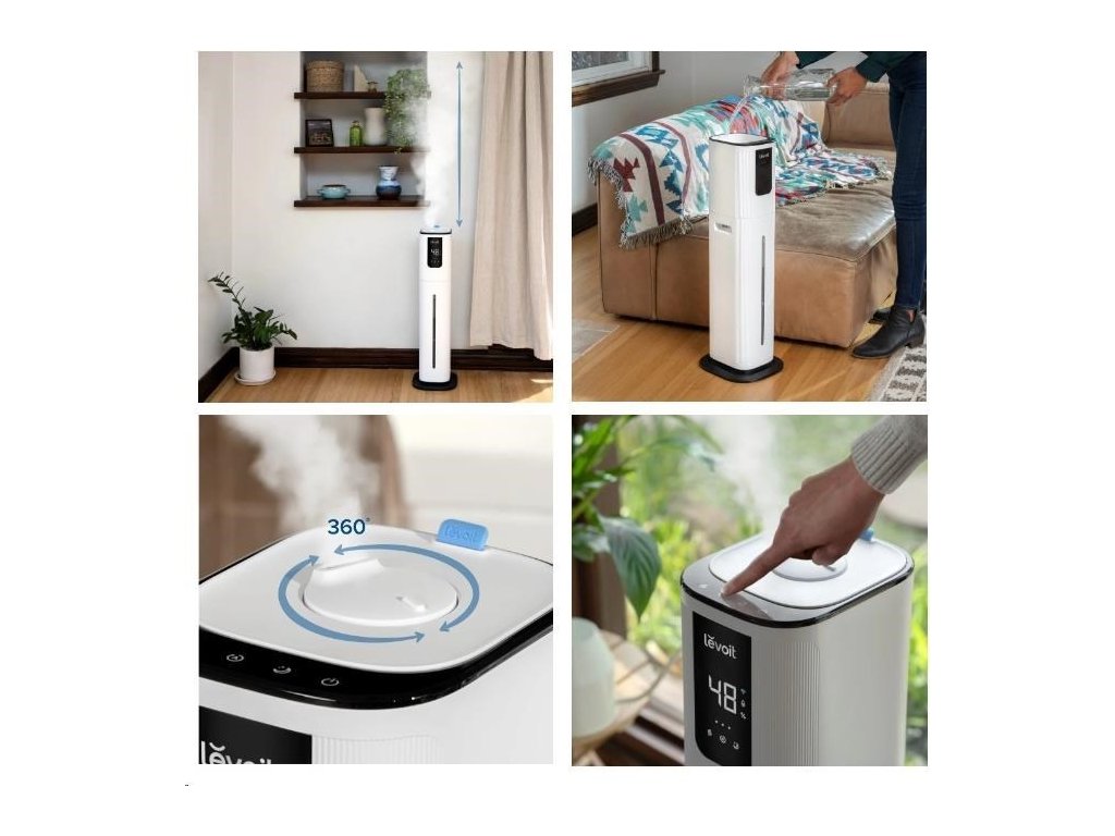 Zvlhčovač Levoit OasisMist Smart je vysoký 72 cm a para je distribuovaná 360° rotujúcou parnou tryskou až do výšky 150 cm. Práve vežovitý dizajn a distribúcia pary do výšky zaručia dokonalé zvlhčenie vzduchu v miestnosti. Pri menších zvlhčovačoch para padá na podlahu príliš rýchlo, kde sa vyzráža na vodu a je nutné ich vždy postaviť na vyvýšené plochy, čo často nevyzerá dobre. Dizajn LEVOIT OASIMIST oceníte aj ako voľne stojaci doplnok interiéru.